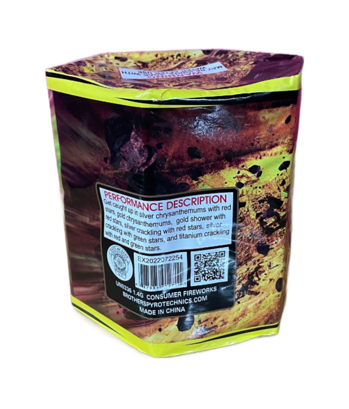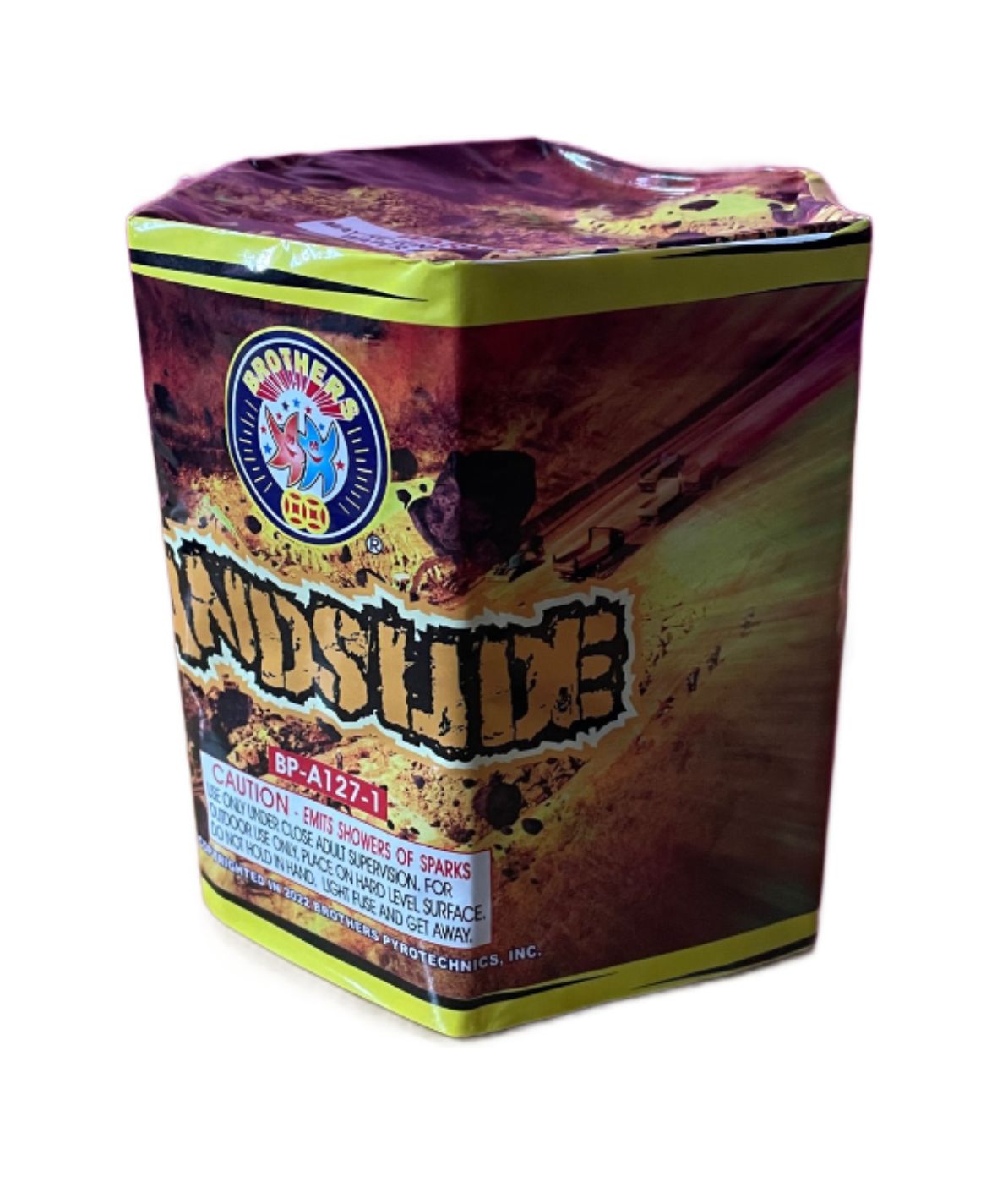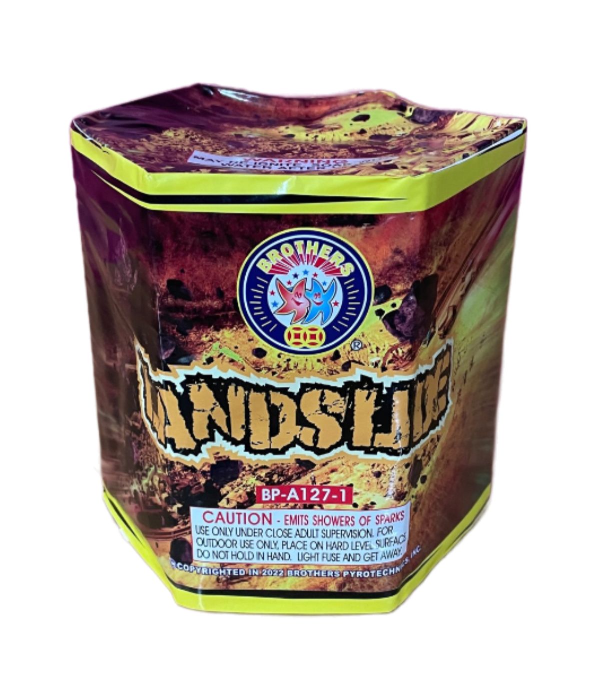 A Cascade of Color! The Landslide is all about the “pour.” It starts with a steady flow of deep orange and gold sparks that quickly builds into a massive, wide-reaching eruption. Unlike fountains that shoot high and thin, Landslide is designed to fill your viewing area with a thick “curtain” of multi-color pearls and heavy crackling gold glitter, creating a truly immersive ground-level experience.