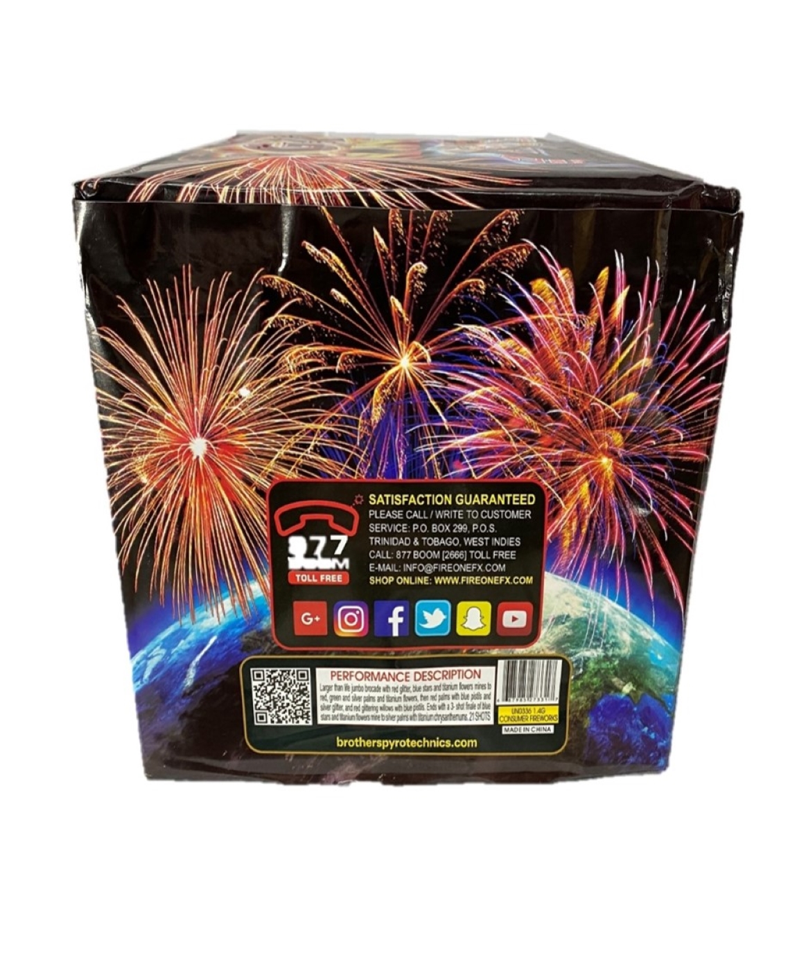 Monumental Effects in 21 Shots! This cake lives up to its name, delivering massive effects typically seen in much larger pieces. Shots rise with glittering mines to burst into colossal brocade crowns, vibrant red and green palms, and stunning silver glitter. It features a continuous, powerful sequence of huge aerial breaks designed to cover the maximum area of the sky!