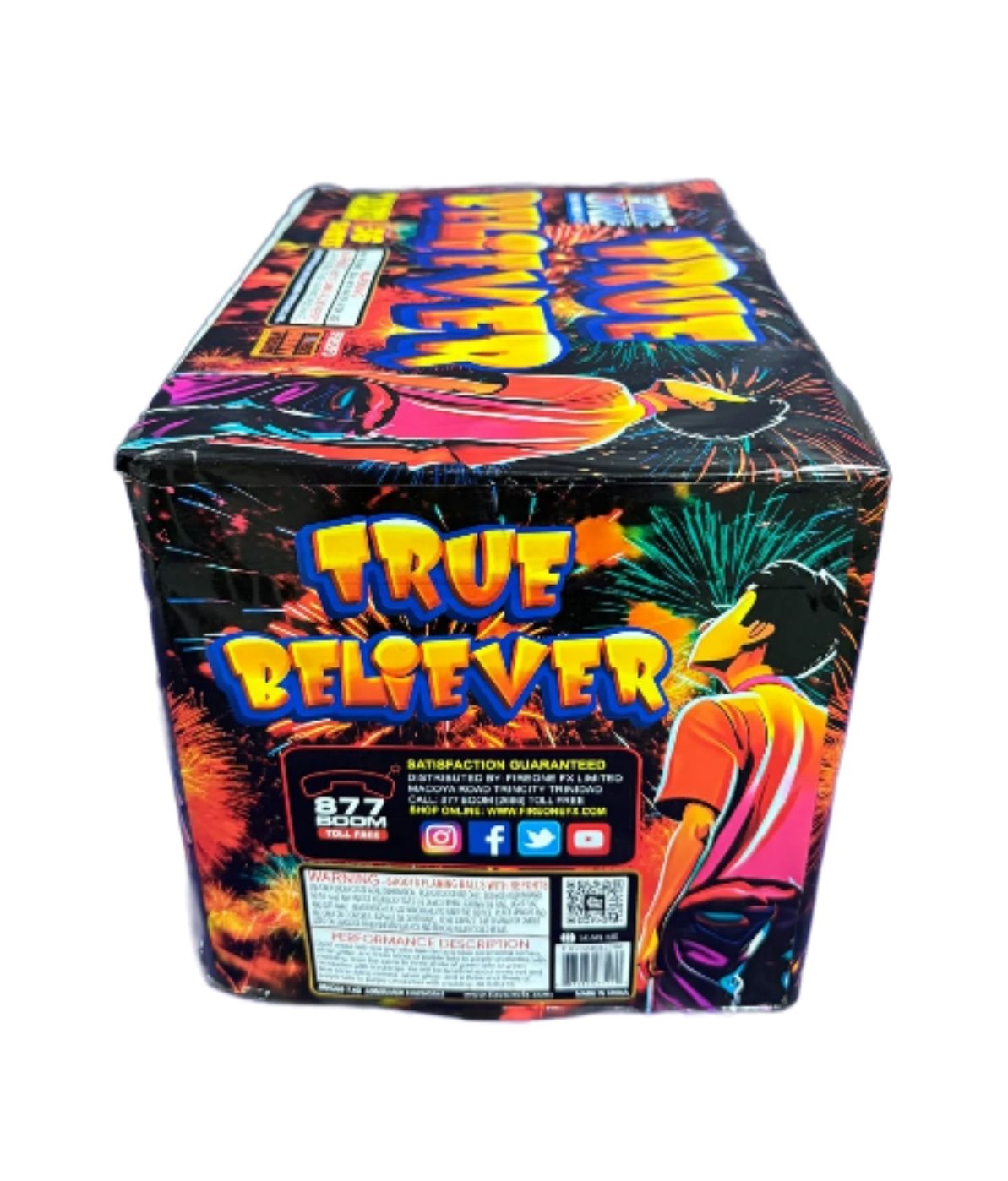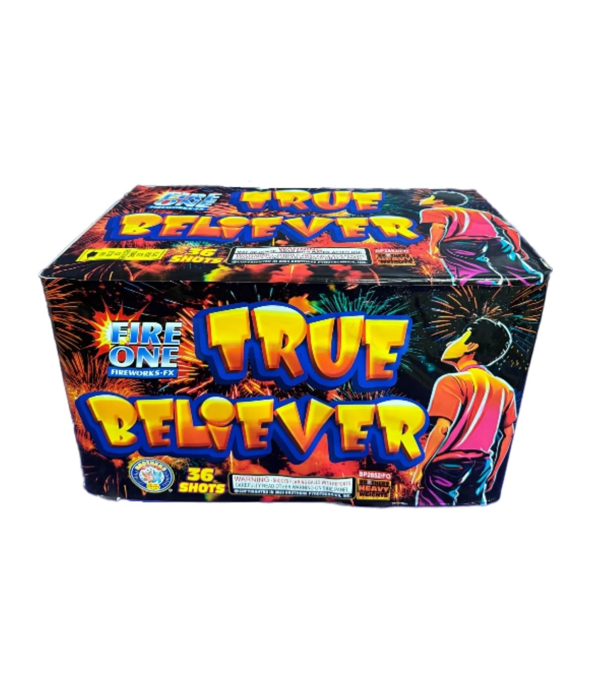 You’ll Be a Believer! This heavy-weight 36-shot cake delivers a unique, frantic, and loud performance. It features continuous sequences of red and blue scrambling comets with shimmering silver glitter. The action builds with rapid-fire bursts of crossettes (breaking into smaller stars) that include intense crackling sound effects, culminating in a powerful, crackling finale.